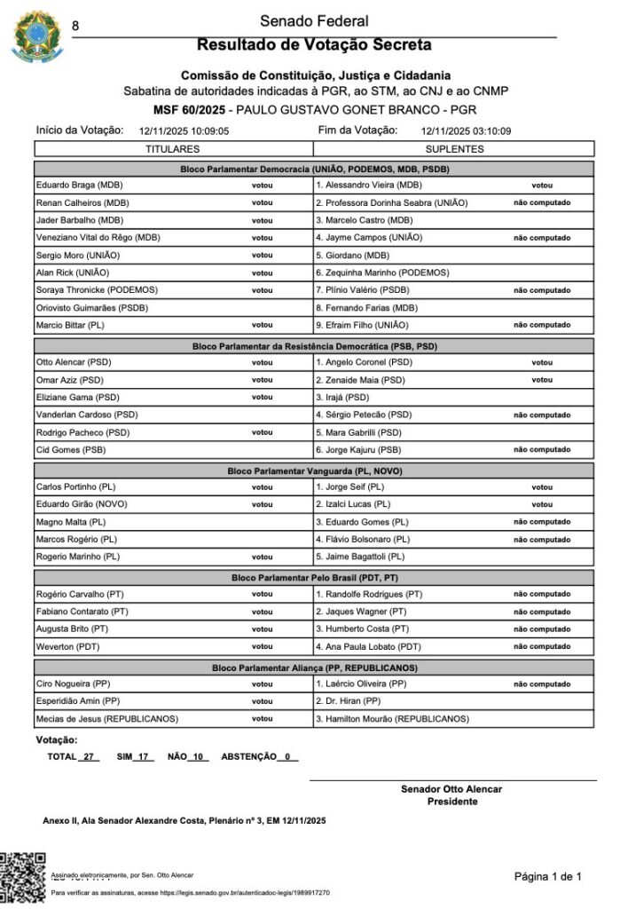 A votação da CCJ que reconduziu Gonet à PGR, assim como a votação no plenário, será secreta. Confira a lista dos senadores que votaram na comissão.