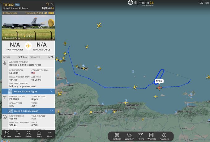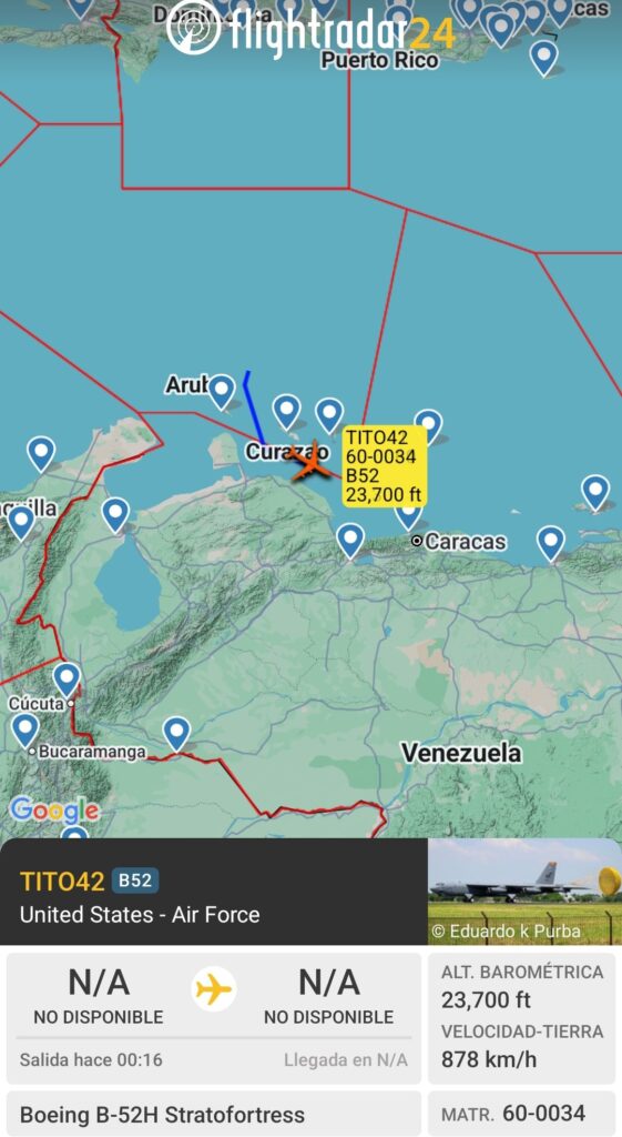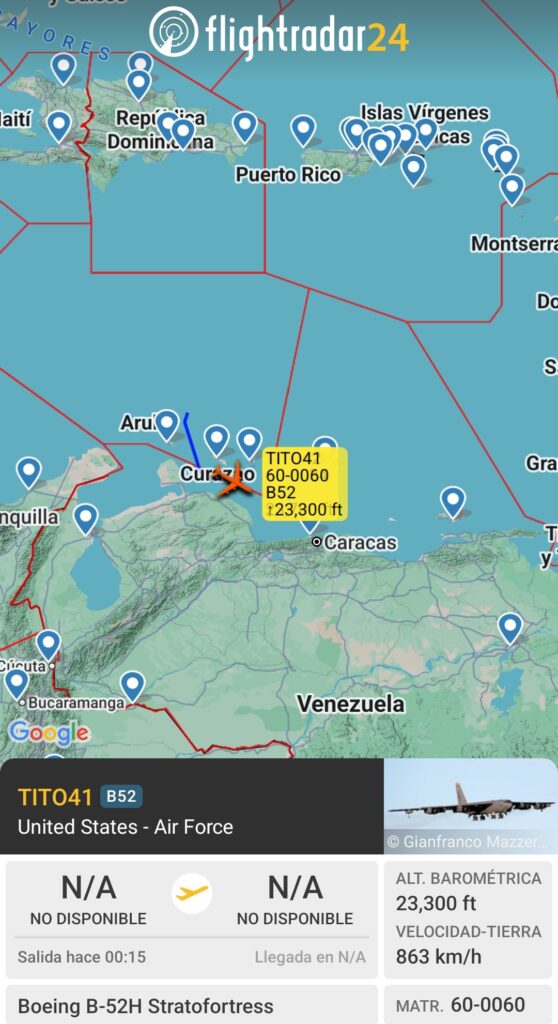 A plataforma especializada Flightradar24 confirmou por meio de uma postagem em sua conta oficial de X que dos bombardeiros B-52 da Força Aérea dos Estados Unidos (USAF) por suas siglas em inglês, sobrevoaram a costa venezuelana
