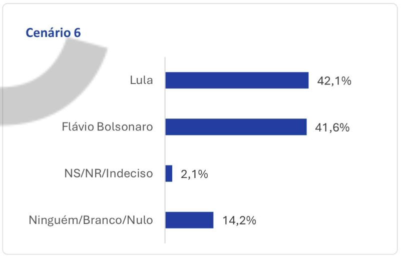 O instituto Gerp, de menor projeção nacional, registrou Flávio com 42% das intenções de voto no segundo turno, contra 41% de Lula – um empate técnico dentro da margem de erro de 2,24 pontos percentuais. O levantamento, realizado entre 6 e 10 de dezembro com 2 mil eleitores em todo o país, é o primeiro da série histórica do instituto a mostrar o senador numericamente à frente do petista.