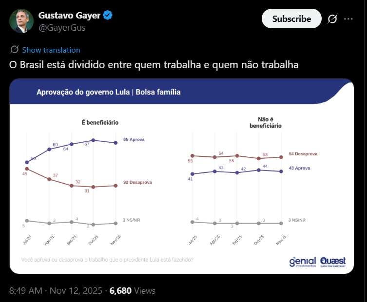 Confira pesquisa recentre da GENIAL QUAEST mostrando a aprovação de Lula entre BENEFICIÁRIOS e NÃO BENEFICÍARIOS do BOLSA FAMILIA