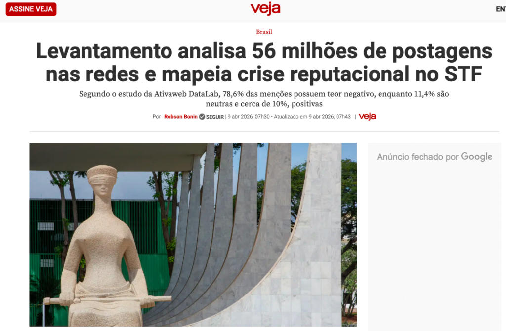 Um amplo levantamento realizado nas redes sociais identificou uma grave crise de reputação do Supremo Tribunal Federal (STF) junto à opinião pública brasileira, de acordo com a matéria da Revista Veja.