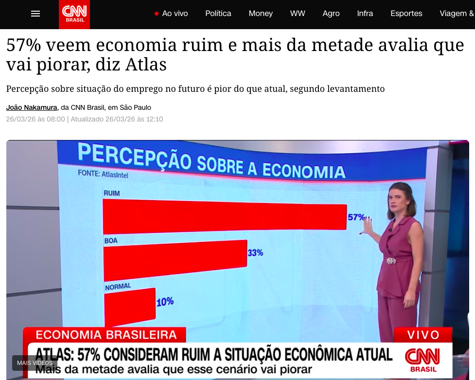 Mais da metade dos brasileiros considera a situação econômica do país ruim e acredita que ela vai se deteriorar ainda mais nos próximos seis meses. É o que aponta a pesquisa Latam Pulse Brasil, realizada pela AtlasIntel em parceria com a Bloomberg, de acordo com a matéria da CNN BRASIL.