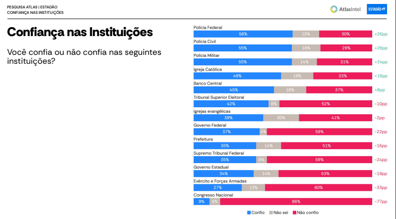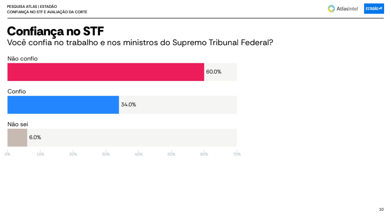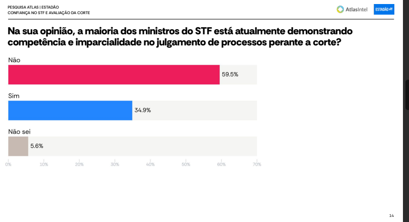 Um levantamento da AtlasIntel, em parceria com o Estadão, divulgado nesta sexta-feira (20), expõe uma crise de imagem profunda no Supremo Tribunal Federal (STF). 60% dos brasileiros afirmam não confiar no trabalho e nos ministros da Corte, enquanto apenas 34% declaram confiar — uma queda de cerca de 15 pontos percentuais desde o segundo semestre de 2025, de acordo com a matéria da CNN BRASIL.