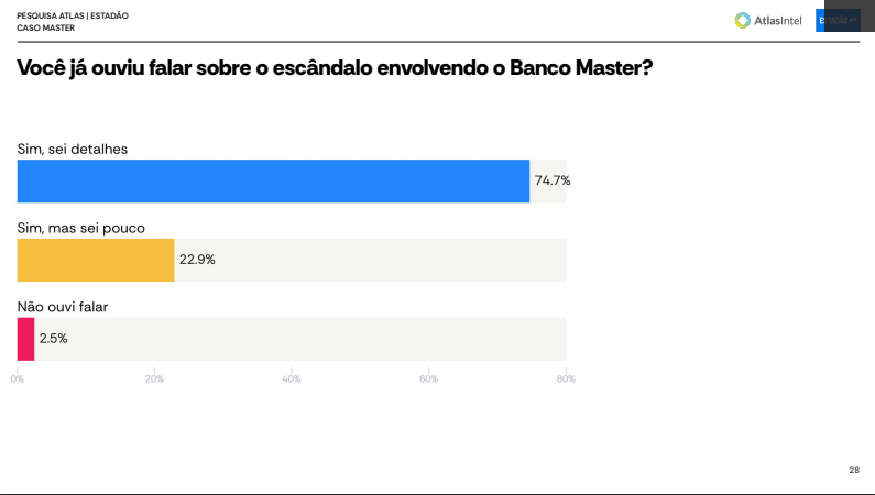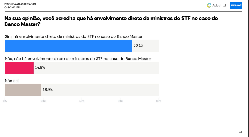 No contexto do caso Banco Master, 66,1% dos entrevistados acreditam haver envolvimento direto de ministros do STF na controvérsia envolvendo o ex-banqueiro Daniel Vorcaro. Apenas 14,9% rejeitam essa hipótese, e 18,9% dizem não saber. Além disso, 76,9% percebem “muita influência” de agentes externos (políticos, partidos e grupos de poder) na análise do processo no Supremo, enquanto 53% defendem que a liquidação do banco não deveria ser julgada pela Corte.
