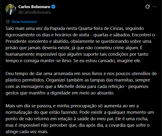 Carlos expressou crescente preocupação com a saúde do pai, destacando o risco de um ponto de não retorno devido às condições prolongadas de prisão. Ele descreveu Bolsonaro como “uma rocha”, mas alertou para o impacto cumulativo da situação.