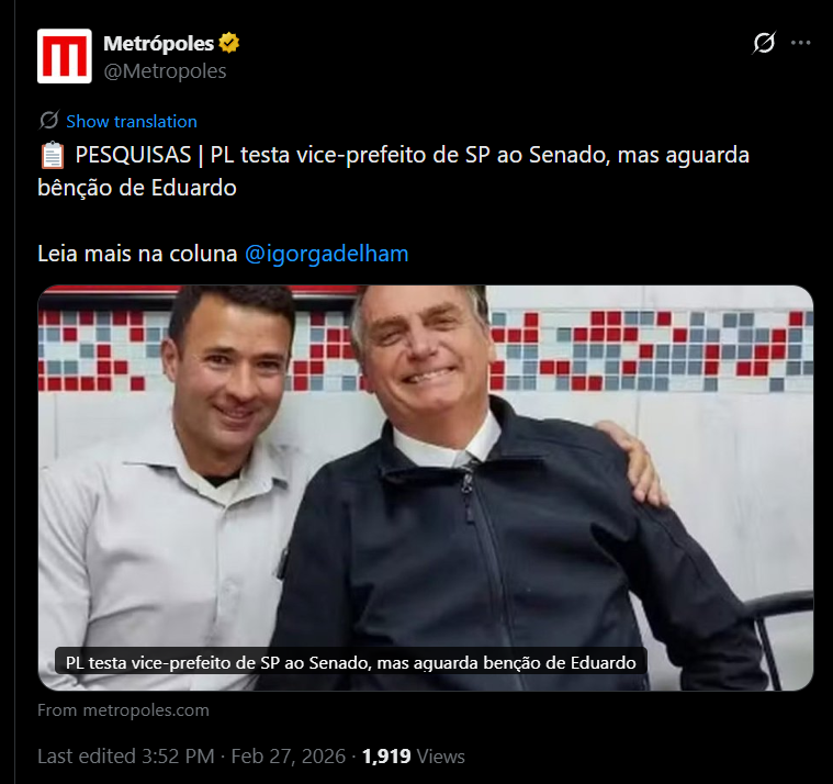 A definição do segundo candidato ao Senado por SP ganha relevância em um estado com duas vagas em disputa e alto peso eleitoral nacional. O PL busca consolidar força na maior unidade da federação, alinhando-se ao projeto de Tarcísio para o governo estadual e evitando fragmentação no campo conservador.