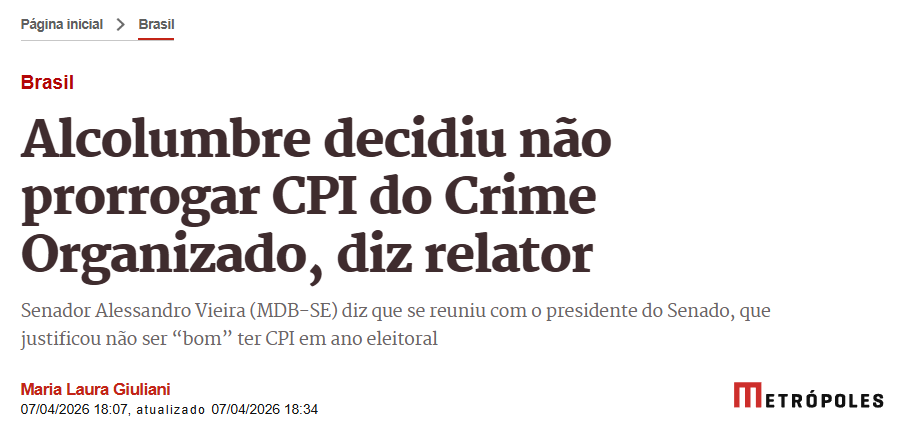 O senador Alessandro Vieira (MDB-SE), relator da CPI do Crime Organizado, acusou o ministro Alexandre de Moraes, do Supremo Tribunal Federal (STF), de ameaçar o Conselho de Controle de Atividades Financeiras (COAF) para impedir a entrega de relatórios de inteligência financeira à comissão.