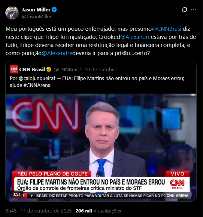 O assessor de Donald Trump, Jason Miller publicou sobre a arbitrariedade cometida com Filipe G Martins, confira abaixo: