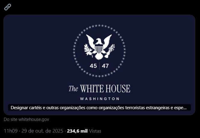 Fonte: https://www.whitehouse.gov/presidential-actions/2025/01/designating-cartels-and-other-organizations-as-foreign-terrorist-organizations-and-specially-designated-global-terrorists/