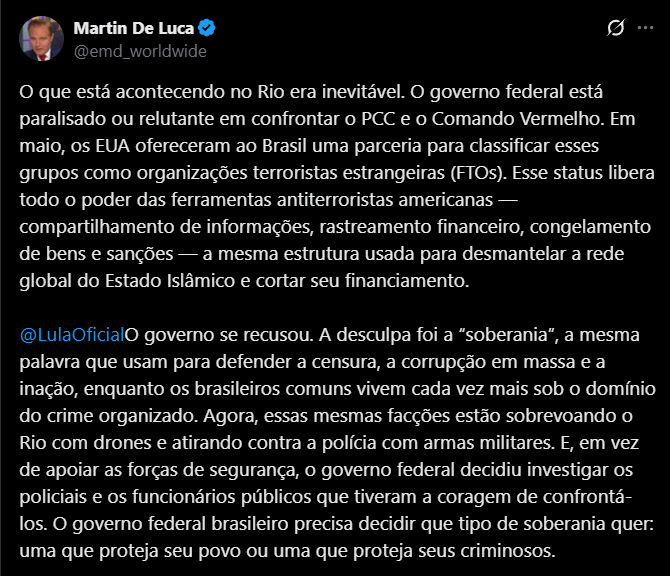 Após a MEGA OPERAÇÃO no Rio de Janeiro que abateu mais de 100 bandidos e apreendeu mais de 100 fuzis, o advogado de Donald Trump se manifestou e fez um duro alerta sobre o regime atual que opera no Brasil: