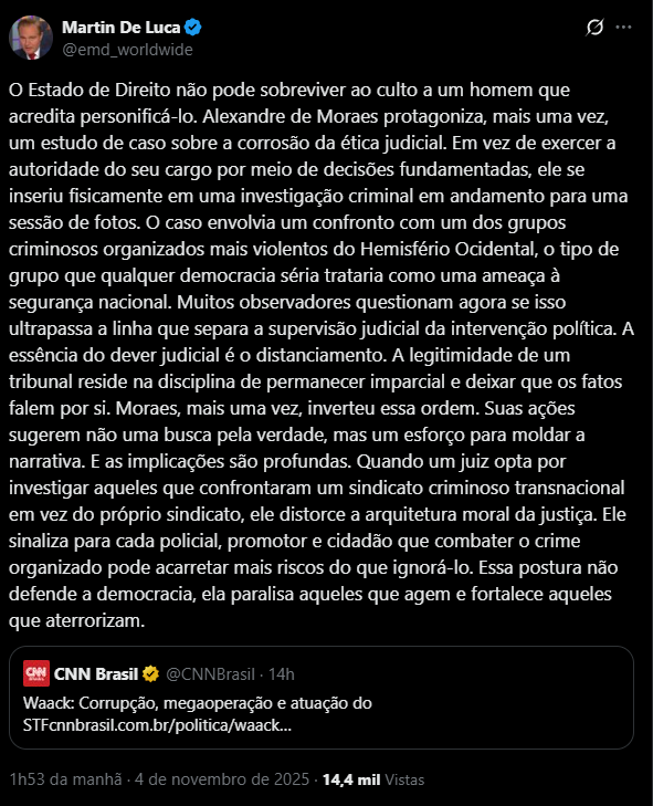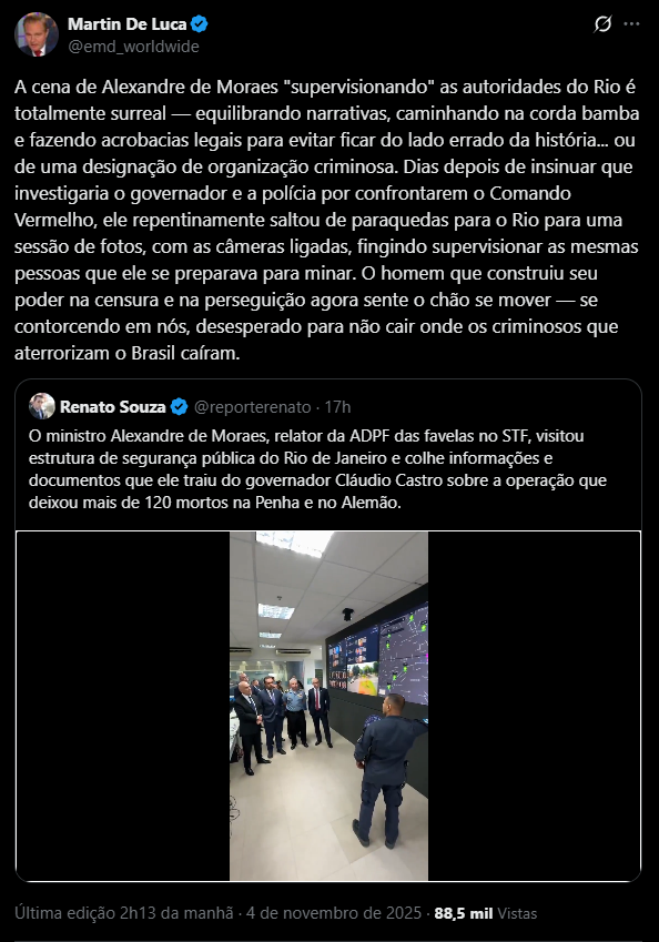 “A cena de Alexandre de Moraes “supervisionando” as autoridades do Rio é totalmente surreal — equilibrando narrativas, caminhando na corda bamba e fazendo acrobacias legais para evitar ficar do lado errado da história… ou de uma designação de organização criminosa.