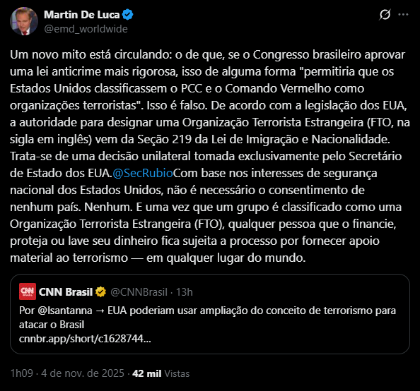 Martin de Luca comentou novamente uma matéria da CNN intitulada “EUA poderiam usar ampliação do conceito de terrorismo para atacar o Brasil”