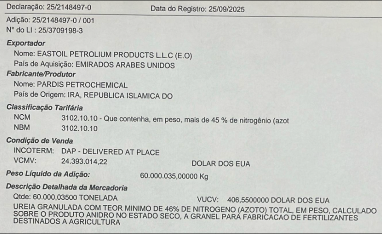 Abaixo Documento de importação mostra origem iraniana da ureia: