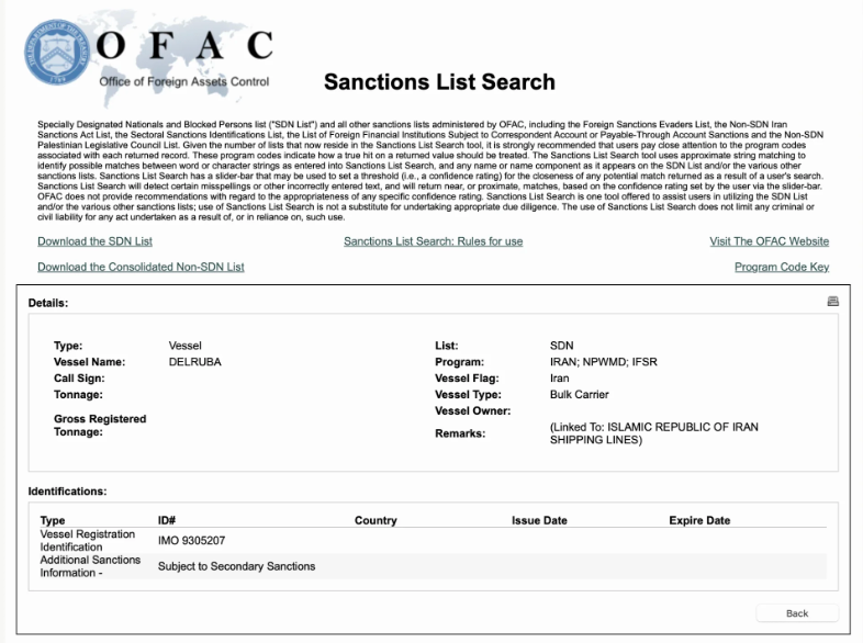 Navio Delruba é sancionado pelo OFAC, dos EUARegistros aduaneiros acessados pela reportagem indicam que as 60 mil toneladas de ureia transportadas provêm da Pardis Petrochemical, igualmente sob bloqueio dos Estados Unidos, e são destinadas à companhia nacional Link Comercial, intermediadas pela Eastoil Petrolium Products LLC, com sede nos Emirados Árabes Unidos.