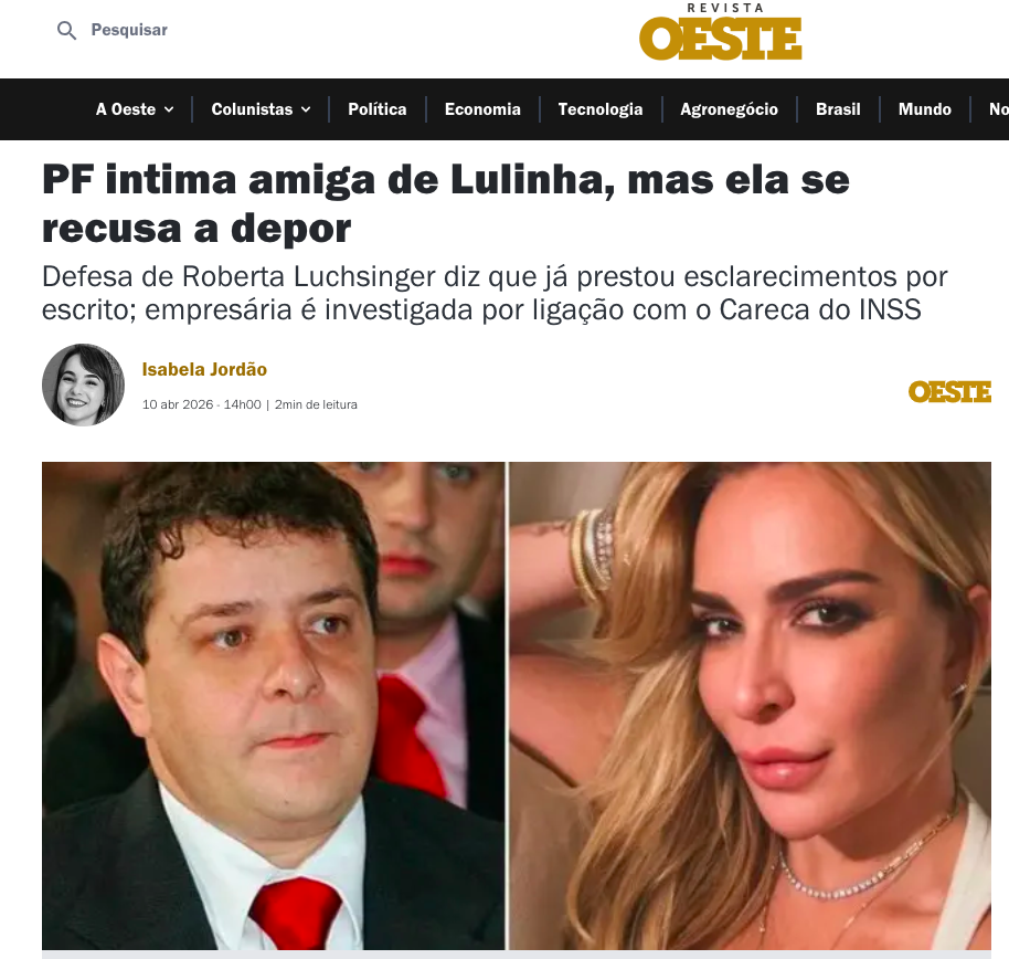 A intimação faz parte da Operação Sem Desconto, deflagrada em dezembro de 2025. Roberta Luchsinger foi alvo de busca e apreensão em uma das fases da operação. Os investigadores apuram se ela atuou como intermediária entre o empresário Antônio Camilo Antunes, o “Careca do INSS” — apontado como líder do esquema —, e Lulinha.