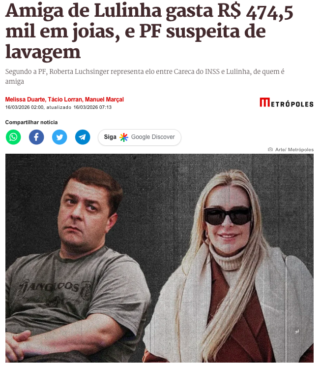 Roberta Luchsinger, amiga próxima de Luís Cláudio Lula da Silva, filho do petista Lula da Silva, gastou R$ 4.745 mil em joias de alto valor, segundo relatório da Polícia Federal obtido pela coluna de Tácio Lorran, do Metrópoles. A PF incluiu as compras no escopo de inquérito que apura suspeita de lavagem de dinheiro e enriquecimento ilícito, de acordo com a matéria do Metrópoles.