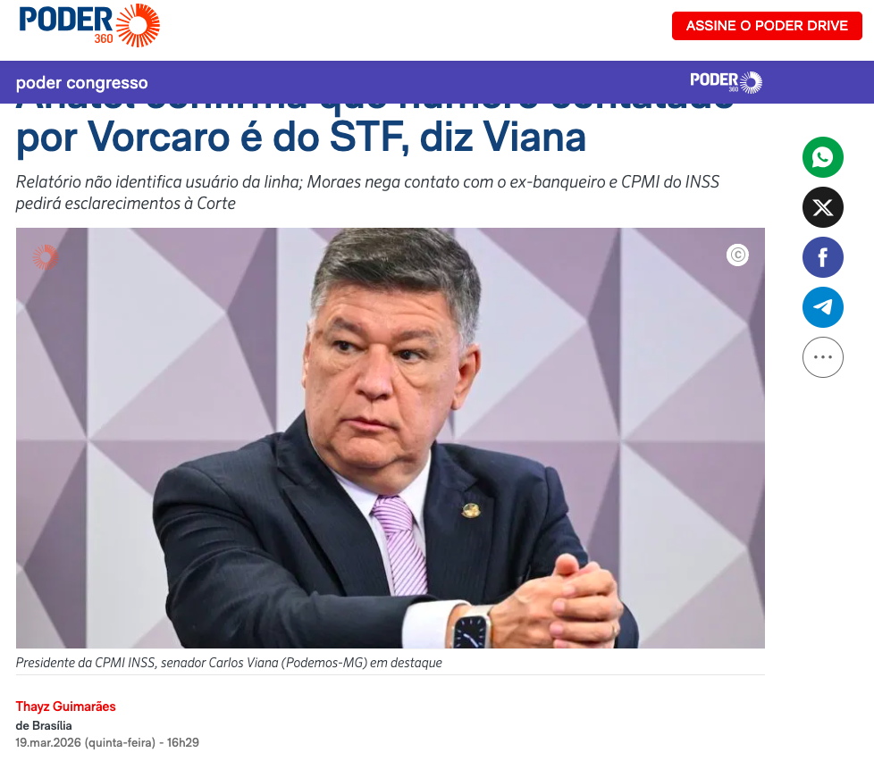 A Anatel confirmou oficialmente que o número de telefone encontrado na agenda apreendida do celular de Daniel Vorcaro (ex-controlador do Banco Master) pertence a uma unidade do Supremo Tribunal Federal (STF), conforme declaração do senador Carlos Viana (Podemos-MG), presidente da CPMI do INSS, de acordo com a matéria do Poder 360.