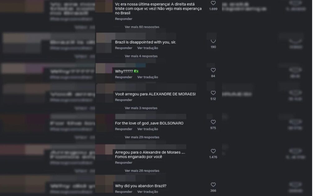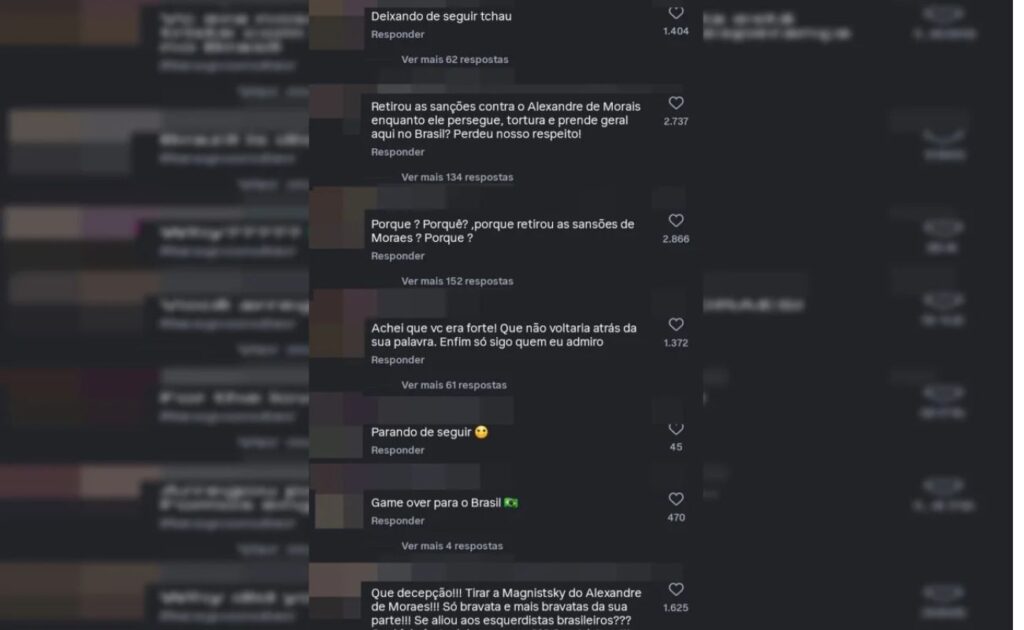 “Deixando de seguir, tchau”, “Game over para o Brasil”, “Por quê? Por quê?”, “Por que retirou as sanções de Moraes” e “Arregou para o Alexandre de Moraes”.
