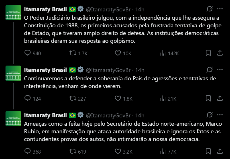 Em réplica, o Ministério das Relações Exteriores do Brasil afirmou que Rubio desconsidera evidências e que intimidações não abalarão o país.