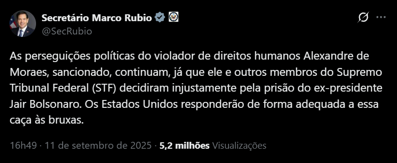 “Ameaças como a feita hoje pelo Secretário de Estado norte-americano, Marco Rubio, em manifestação que ataca autoridade brasileira e ignora os fatos e as contundentes provas dos autos, não intimidarão a nossa democracia”, replicou o ministério também no X.