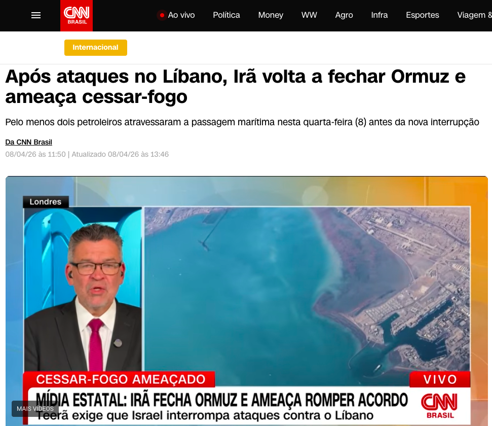 O Irã anunciou nesta quarta-feira (8 de abril de 2026) o fechamento novamente do Estreito de Ormuz, principal via marítima para o transporte de petróleo no mundo, em resposta a novos ataques israelenses no Líbano, de acordo com a matéria da CNN BRASIL.