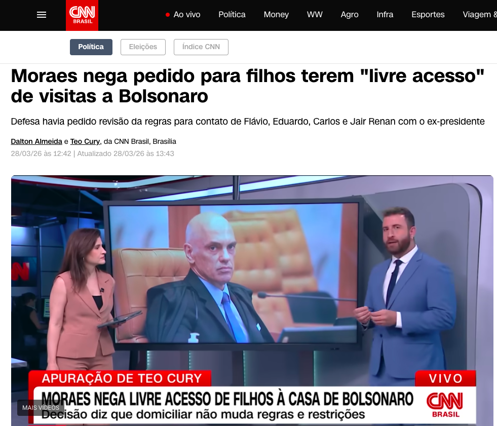 O ministro Alexandre de Moraes, do Supremo Tribunal Federal (STF), rejeitou o pedido da defesa do presidente Jair Bolsonaro para conceder “livre acesso” dos filhos à residência onde ele cumpre domiciliar temporária no Jardim Botânico, em Brasília, de acordo com a matéria da CNN BRASIL.