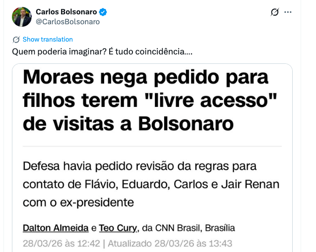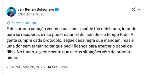 A decisão foi publicada neste sábado (28 de março de 2026), um dia após Bolsonaro receber alta hospitalar e retornar para casa. Moraes classificou o pedido como algo que “carece de qualquer viabilidade jurídica” e reforçou que a domiciliar concedida por razões de saúde “não implicou alteração do regime de cumprimento de pena, que permanece sendo o fechado”.