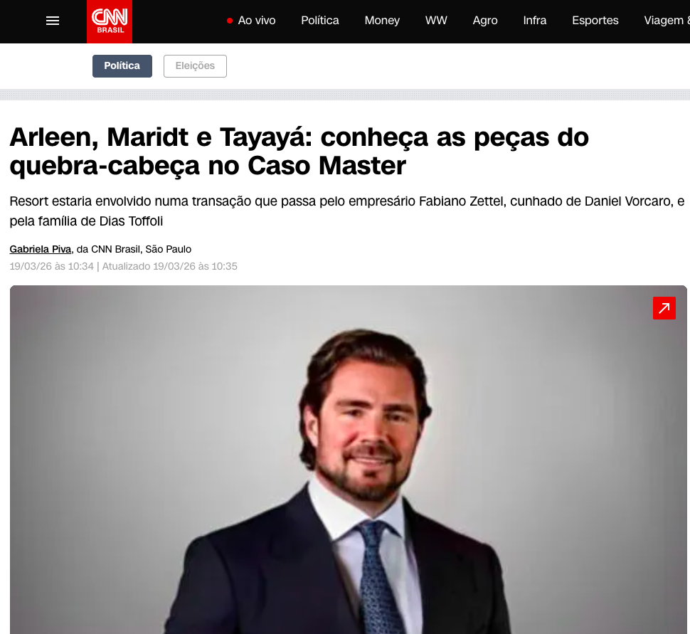 A CNN Brasil publicou reportagem exclusiva que mapeia as principais conexões entre Arleen, Maridt e Tayaya no contexto das investigações sobre fraudes bilionárias no Banco Master, liquidado extrajudicialmente em novembro de 2025.