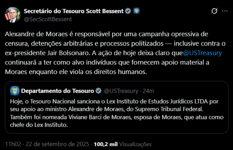 O secretário do Tesouro, Scott Bessent, declarou que tais providências sinalizam o compromisso da gestão em continuar a punir pessoas que apoiam Moraes, enquanto, de acordo com Bessent, o ministro pratica “abusos contra os direitos humanos”.