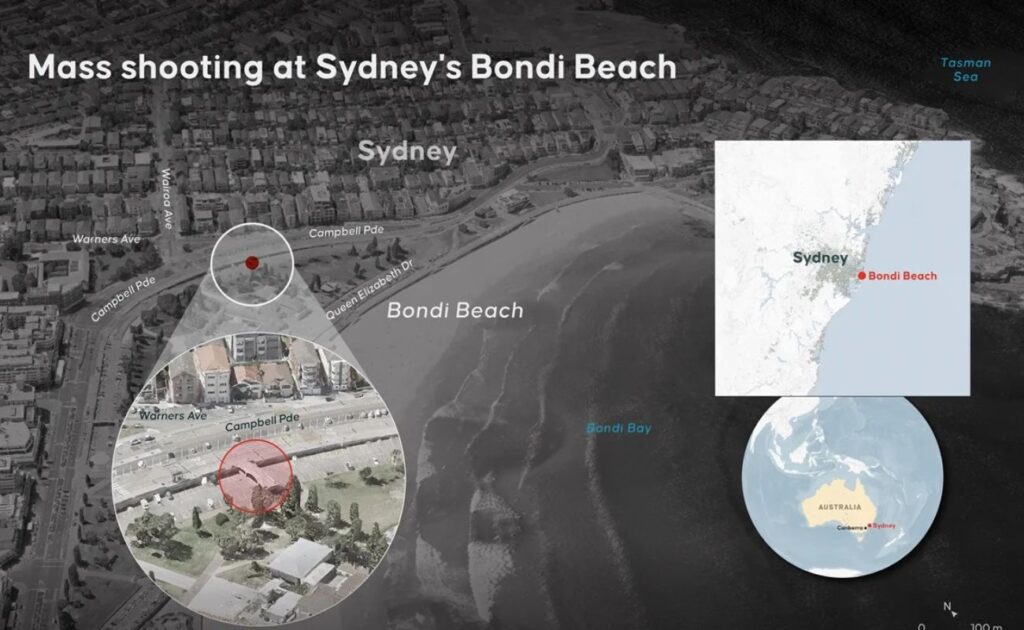 “Este ataque foi planejado para atingir a comunidade judaica de Sydney”, declarou o premier de Nova Gales do Sul, Chris Minns. O massacre foi declarado um ataque terrorista devido ao evento visado e às armas utilizadas, afirmou Lanyon.