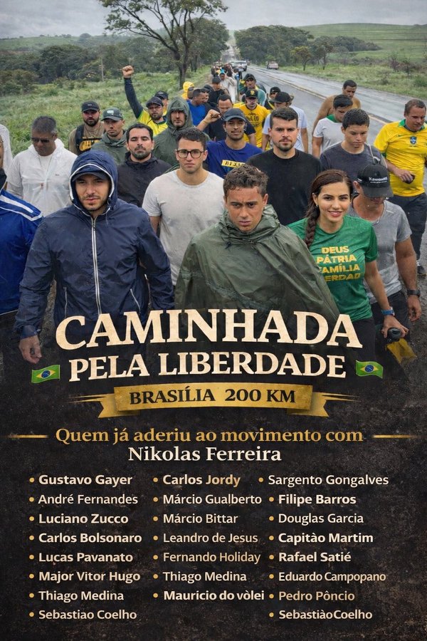 Já em Brasília, a chegada prevista da Caminhada pela Justiça e Liberdade, organizada pelo deputado federal Nikolas Ferreira (PL-MG) no dia 25/01 na PRAÇA DO CRUZEIRO: