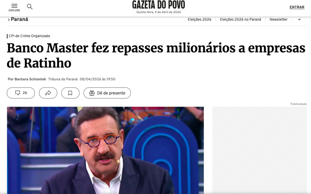 O Banco Master realizou repasses milionários a empresas ligadas ao apresentador Ratinho e ao Grupo Massa, segundo documentos da Receita Federal obtidos pela CPI do Crime Organizado, de acordo com a matéria da Gazeta do Povo.
