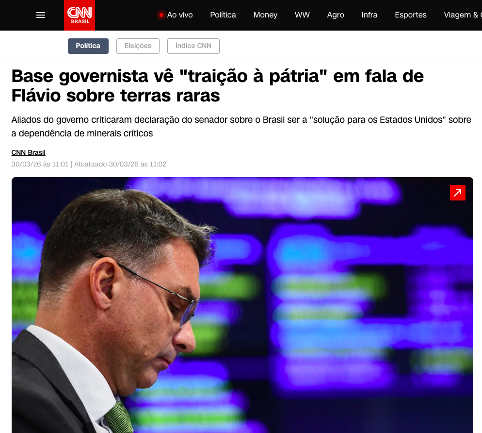 Aliados do governo federal classificaram como “traição à pátria” e ameaça à soberania brasileira as declarações do senador Flávio Bolsonaro (PL-RJ) sobre os minerais críticos e terras raras do Brasil, de acordo com a matéria da CNN BRASIL.