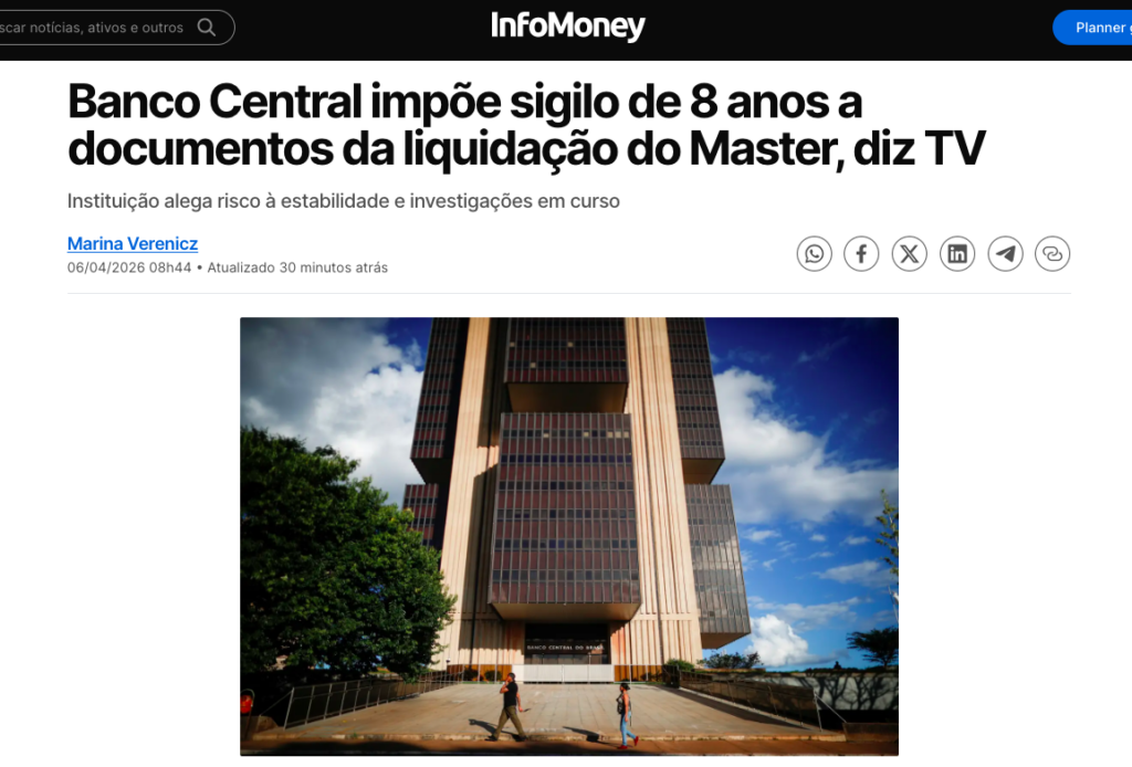 O Banco Central do Brasil decidiu impor sigilo de oito anos aos documentos relacionados à liquidação extrajudicial do Banco Master. A medida, tomada pelo presidente da instituição, Gabriel Galípolo, em novembro de 2025, só permitirá a divulgação dos arquivos a partir de novembro de 2033, de acordo com a matéria do InfoMoney.