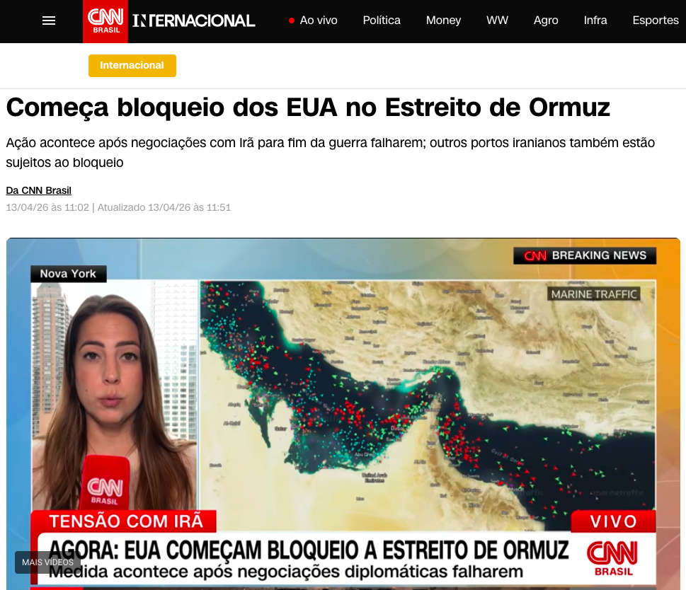 O bloqueio naval imposto pelos Estados Unidos no Estreito de Ormuz teve início nesta segunda-feira (13), após o fracasso das negociações de paz com o Irã. A ação, confirmada pelo Comando Central dos EUA (CENTCOM), visa pressionar Teerã ao restringir o fluxo de recursos para o regime iraniano em meio ao conflito armado, de acordo com a matéria da CNN BRASIL.