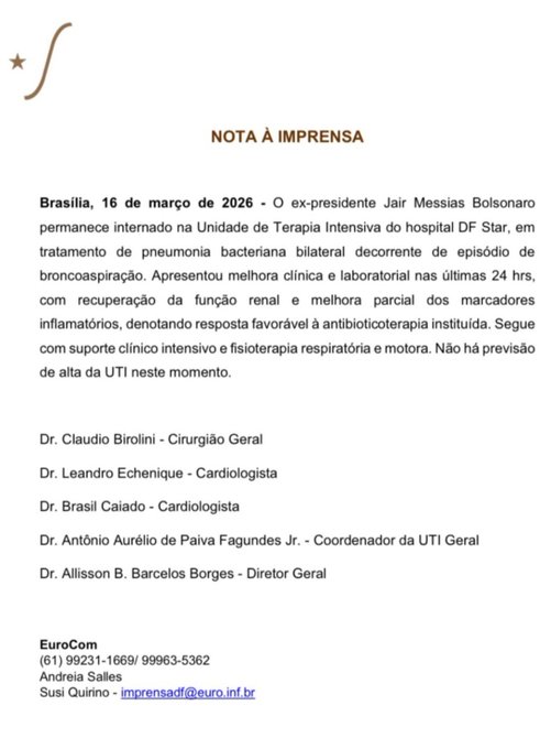 O quadro evoluiu positivamente nas últimas horas, com redução da febre, estabilização da saturação de oxigênio e diminuição da inflamação pulmonar. A equipe médica mantém monitoramento intensivo, mas não há previsão de alta imediata da UTI.
