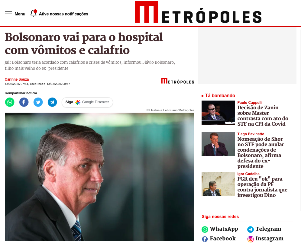 O presidente Jair Bolsonaro (PL) foi levado ao hospital na manhã desta sexta-feira (13) após apresentar vômitos e calafrios. A informação foi confirmada pelo senador Flávio Bolsonaro (PL-RJ), filho do mandatário, que está acompanhando o pai, de acordo com a matéria do Metrópoles.