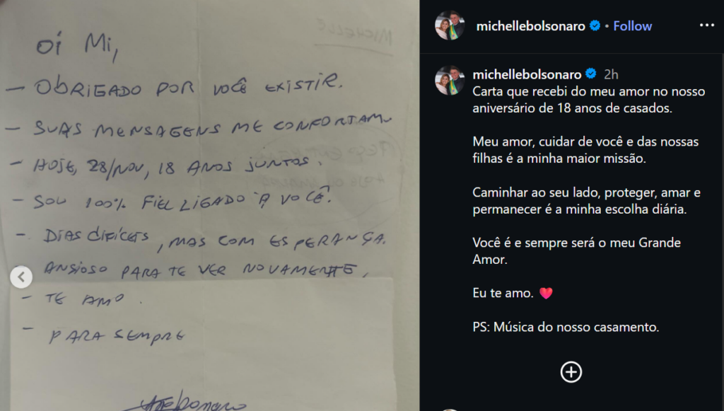 Michelle publicou o conteúdo acompanhado de foto da carta e legenda emocionada, agradecendo a Deus pela jornada compartilhada e pela força recebida para enfrentar os desafios atuais.