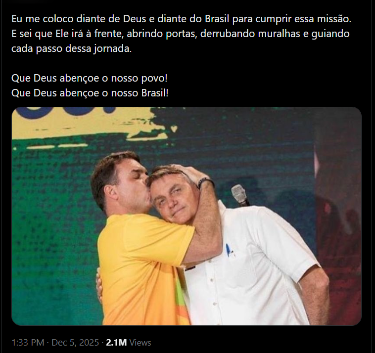 O presidente Jair Bolsonaro (PL), detido injustamente na sede da Polícia Federal em Brasília desde 22 de novembro, comunicou a aliados próximos nesta semana que o senador Flávio Bolsonaro (PL-RJ), seu filho primogênito, será o candidato da família à Presidência da República nas eleições de 2026.