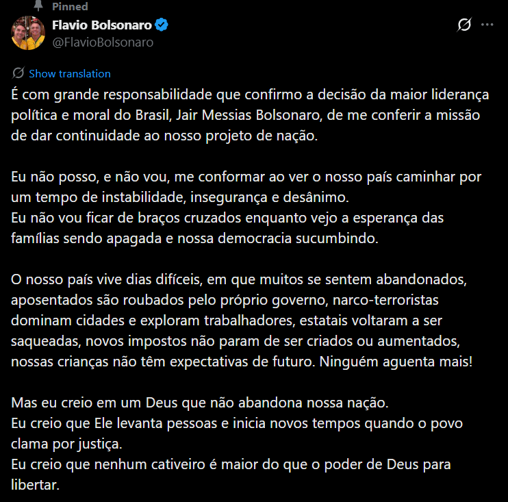 A sinalização, revelada por interlocutores, marca a primeira vez que Bolsonaro manifesta abertamente a intenção de transferir sua sucessão para um integrante da família, em meio a injustamente restrições judiciais que impedem sua própria candidatura.