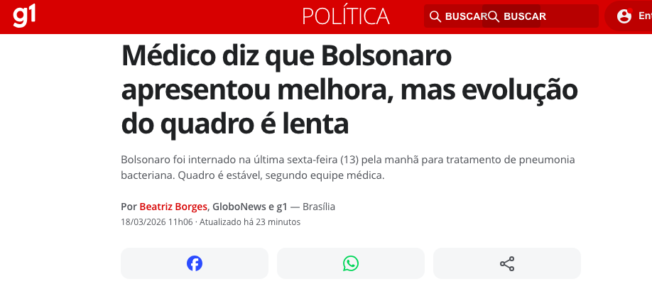 O presidente Jair Bolsonaro (PL) apresenta melhora progressiva no quadro de broncopneumonia bilateral que motivou sua internação emergencial há cinco dias. A informação foi confirmada pelo médico responsável pelo acompanhamento, em novo boletim divulgado nesta quarta-feira (18), de acordo com a matéria do G1.