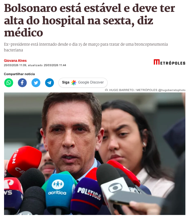 O presidente Jair Bolsonaro (PL) apresenta quadro clínico estável e deve receber alta hospitalar nesta sexta-feira (27 de março de 2026). A informação foi confirmada nesta quarta-feira (25 de março) pela equipe médica durante coletiva de imprensa no Hospital DF Star, na capital federal.