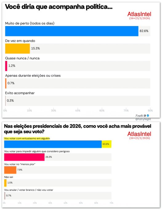 AtlasIntel revela alto engajamento político: 82,6% acompanham política diariamente e 63,6% votarão com entusiasmo em 2026