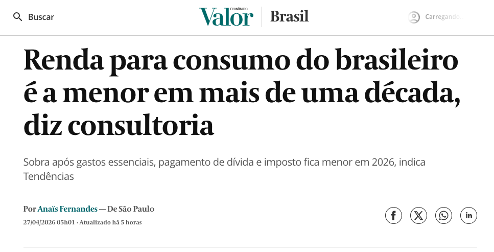O indicador, que mede a capacidade real de consumo das famílias, atingiu em 2026 o patamar mais baixo desde 2011, segundo a consultoria. Apesar do mercado de trabalho ainda mostrar força, com geração de emprego e renda do trabalho em patamares elevados, o peso crescente das dívidas está comprimindo o orçamento doméstico.