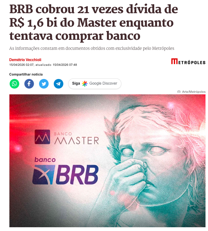 O Banco de Brasília (BRB) enviou pelo menos 21 e-mails de cobrança ao Banco Master entre julho e agosto de 2025, cobrando uma dívida que chegou a ultrapassar R$ 1,6 bilhão, ao mesmo tempo em que tentava comprar a instituição, de acordo com a matéria do Metrópoles.
