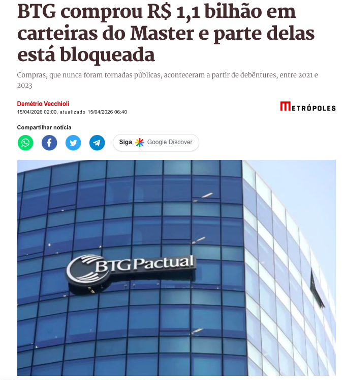O BTG Pactual comprou R$ 1,15 bilhão em carteiras de crédito consignado originadas pelo Banco Master (por meio do Credcesta) entre 2021 e 2023. As operações foram realizadas de forma discreta, por meio de debêntures emitidas pela CB Securitizadora, e nunca foram tornadas públicas na época, de acordo com a matéria do Metrópoles.