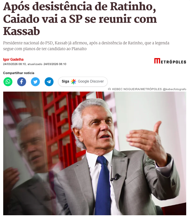 Um dia após a desistência do governador do Paraná, Ratinho Jr., da disputa presidencial, o governador de Goiás, Ronaldo Caiado, desembarcou em São Paulo para uma reunião estratégica com o presidente nacional do PSD, Gilberto Kassab, de acordo com a matéria do Metrópoles.
