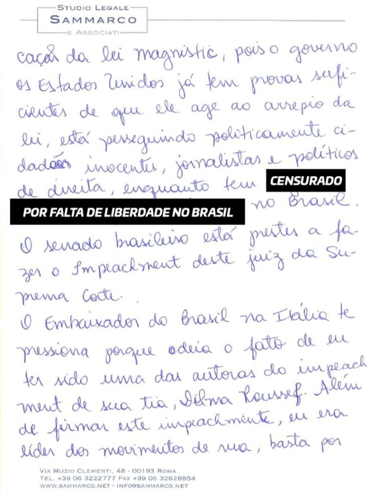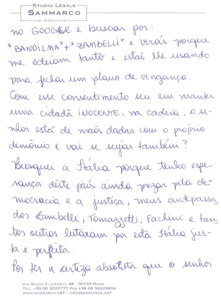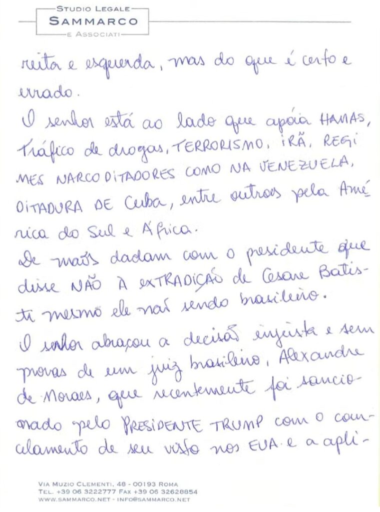 “Soube que o senhor se manifestou a favor da manutenção da minha prisão, depois da pressão do presidente do Brasil, Lula, e do embaixador do Brasil na Itália. Dessa forma, o senhor coloca ao seu lado o homem mais da história do Brasil e talvez do mundo. Não se trata de direita ou esquerda, mas de certo ou errado. O senhor está ao lado que (sic) apoia Hamas, tráfico de drogas, terrorismo, Irã, regimes narcoditadores como na Venezuela, ditadura de Cuba, entre outros pela América do Sul e da África. De mãos dadas com o presidente que disse NÃO À EXTRADIÇÃO de Cesare Battisti, mesmo ele não sendo brasileiro”, argumentou.