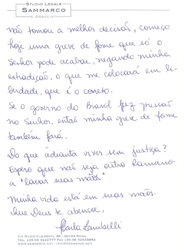 Por fim, a deputada anunciou que, a partir de agora, se absterá de consumir alimentos até que a Itália se posicione contra sua extradição para o Brasil. Ela afirmou que, para ela, “não há sentido em viver sem justiça”.”Por ter a certeza absoluta que o senhor não tomou a melhor decisão, começo hoje uma greve de fome que só o senhor pode acabar, negando minha extradição, o que me colocará em liberdade, que é o correto. Se o governo do Brasil fez pressão no senhor, então minha greve de fome também fará. Do que adianta viver sem justiça? Espero que não seja outro romano a “lavar suas mãos”. Minha vida está em suas mãos –”, frisou.