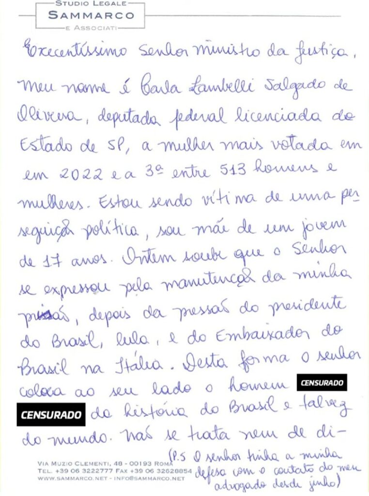 No documento, compartilhado por Zambelli e seu advogado, Fabio Pagnozzi, a deputada alega ser alvo de perseguição política por sua atuação como parlamentar no Brasil e solicita que o ministro tome uma decisão baseada no que é “justo”, sem considerar questões políticas (leia a carta completa ao final desta matéria).